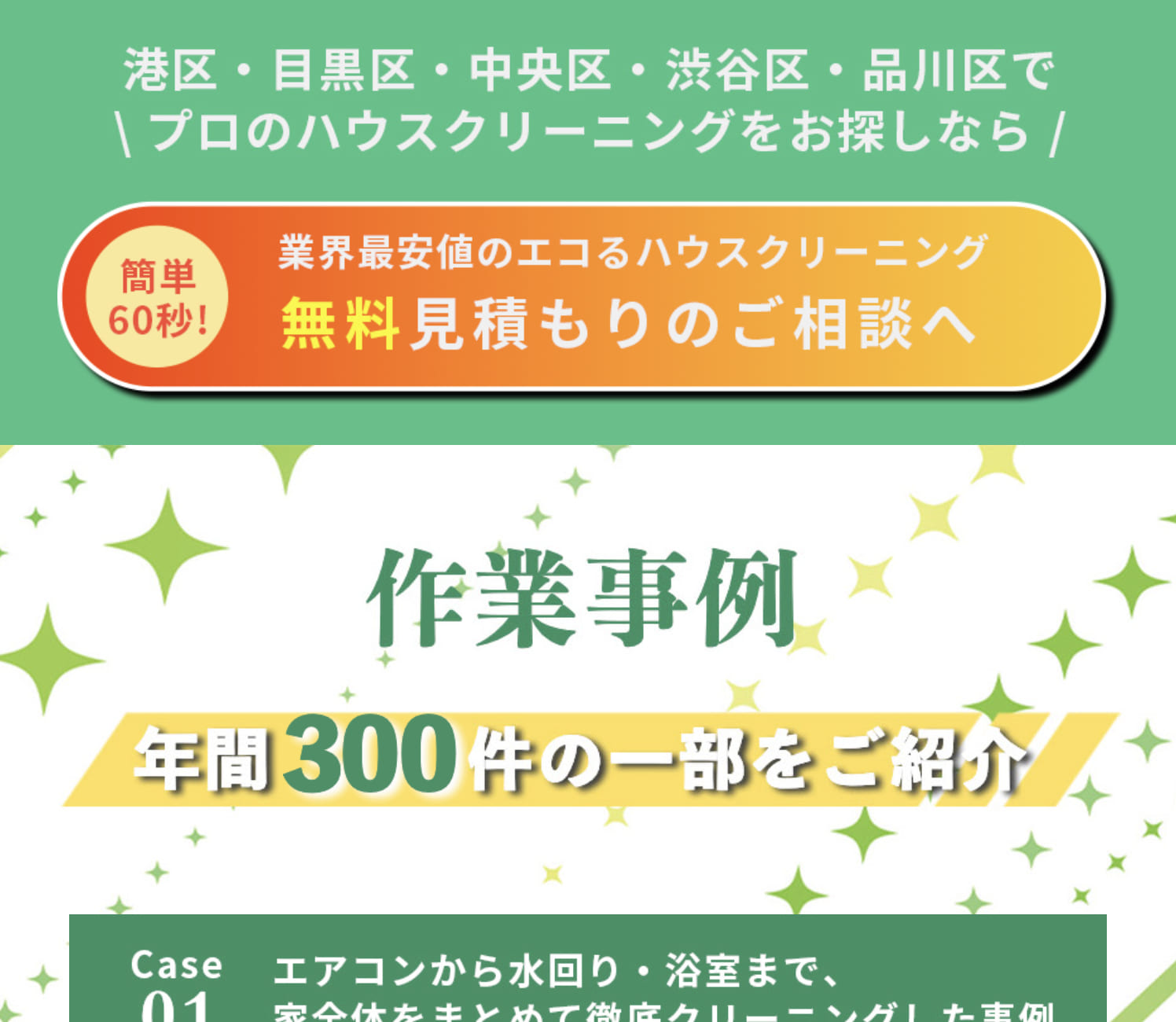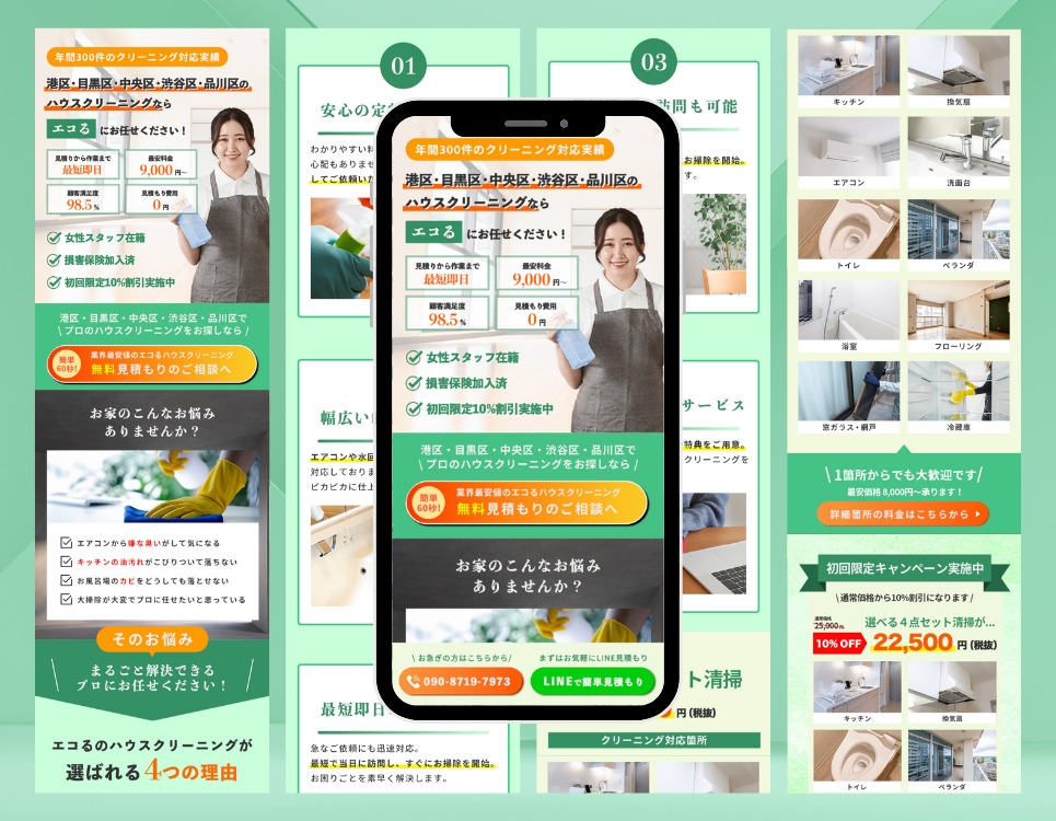 日々の清掃やお家のメンテナンスに真心を込めるハウスクリーニング業者として、緑を基調とした温かみのあるデザインで、安心感を感じられるLPを制作しました。